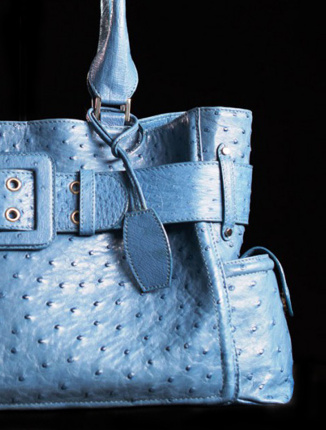 Diese Tasche wirkt aufgrund der dekorativen Applikationen und Details sehr stylisch und hat den gewissen Chic. Sie wurde in ozeanblauem Straußenleder hergestellt. Innen ist sie mit französischem Nappaleder höchster Güte ausgestattet und hat, wie üblich, verschiedene praktische Fächer für die Dinge die man immer wieder schnell zur Hand haben muss.