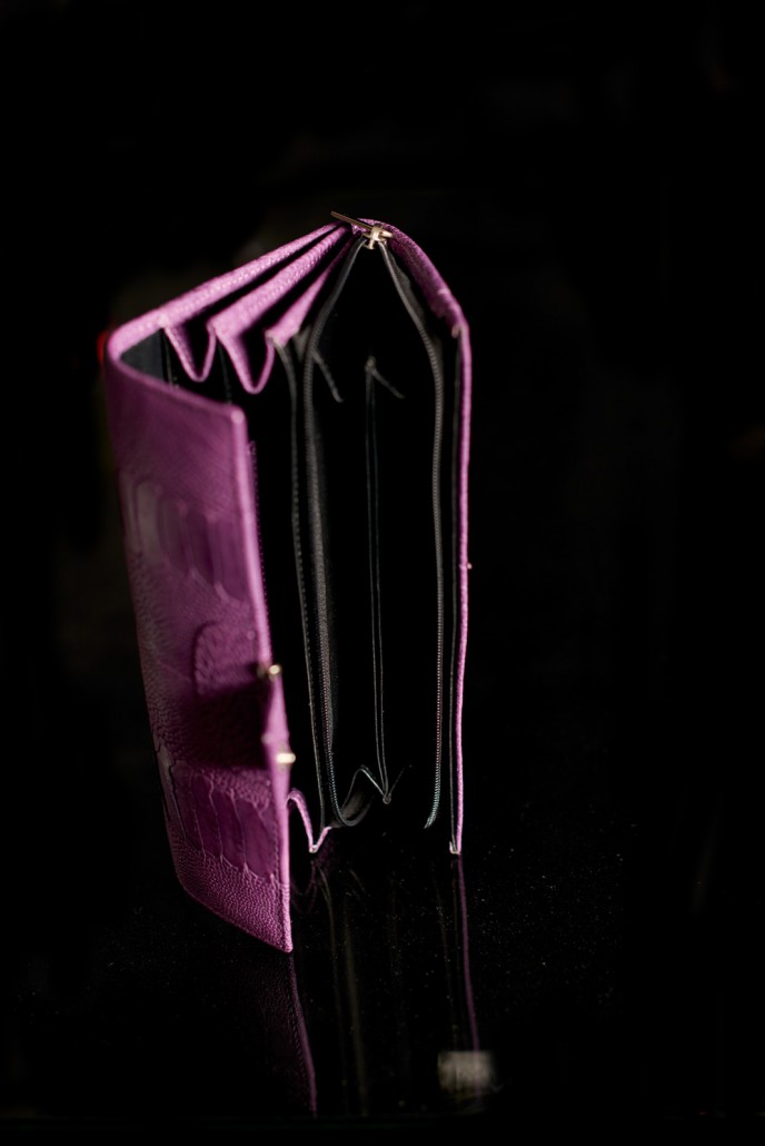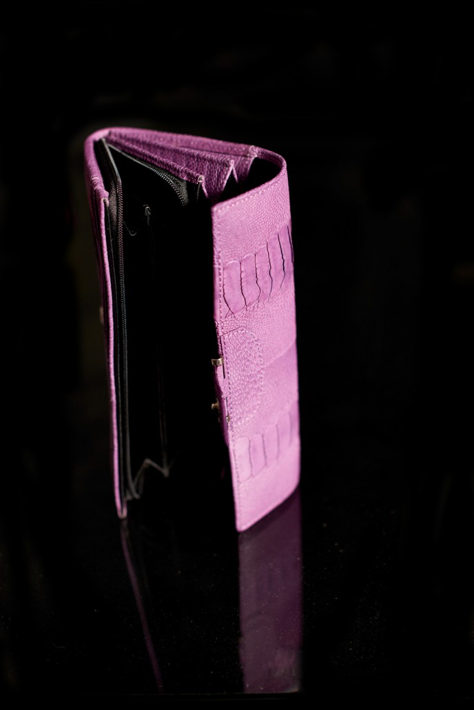 Das interessante Aussehen dieses Portemonnaies entsteht durch die natürliche Musterung des Straußenbeinleders. Die ausgefallene Violett bringt diese besondere Oberflächenstruktur hervorragend zur Geltung.